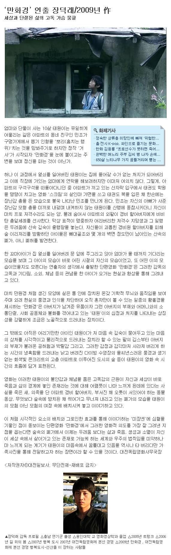 '만화경' 연출 장덕래 감독 페이지 정보 작성자 최고관리자 댓글 0건 조회 5,137회 작성일 13-04-29 11:45 목록 본문 미디어톡 장덕래 감독 관련 기사 이전글장편 다큐 '조치원' - 장덕래 감독 13.04.30 다음글국산 리얼 3D 입체 단편영화들의 '반격' 13.04.29 댓글 0 댓글목록 등록된 댓글이 없습니다.